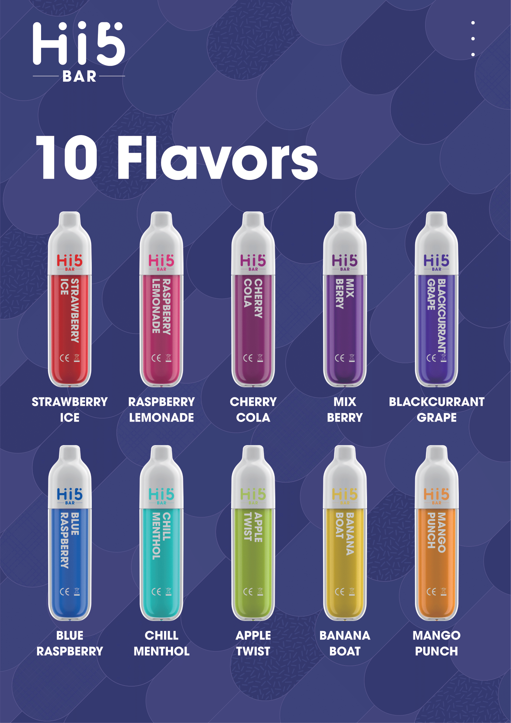 Hi5 bar Disposable Vape Mix Berry Flavor Nicotine:2% Liquid Capacity:2ml Battery Capacity: 500 mAh Resistance:1.2 Ω Coil: Mesh Coil Puffs: 600