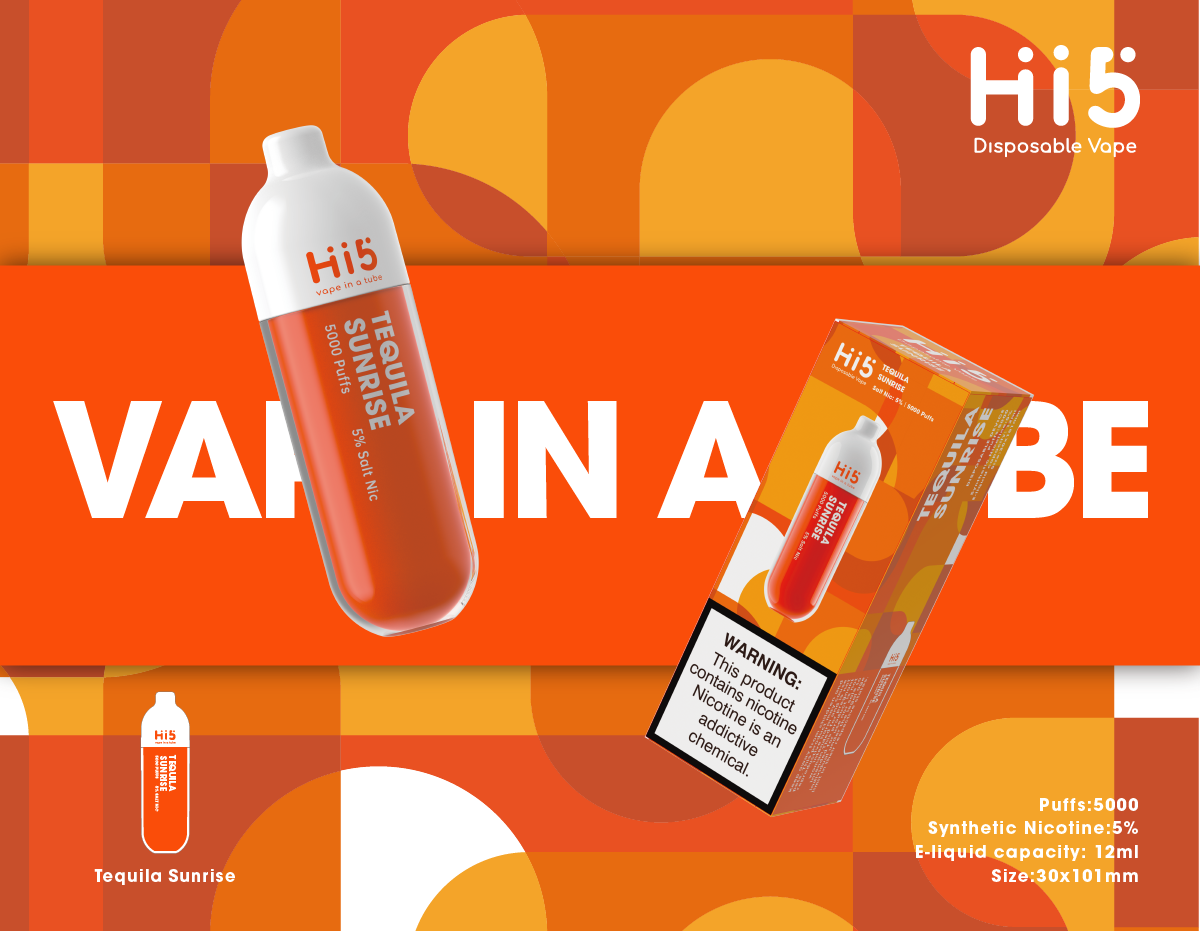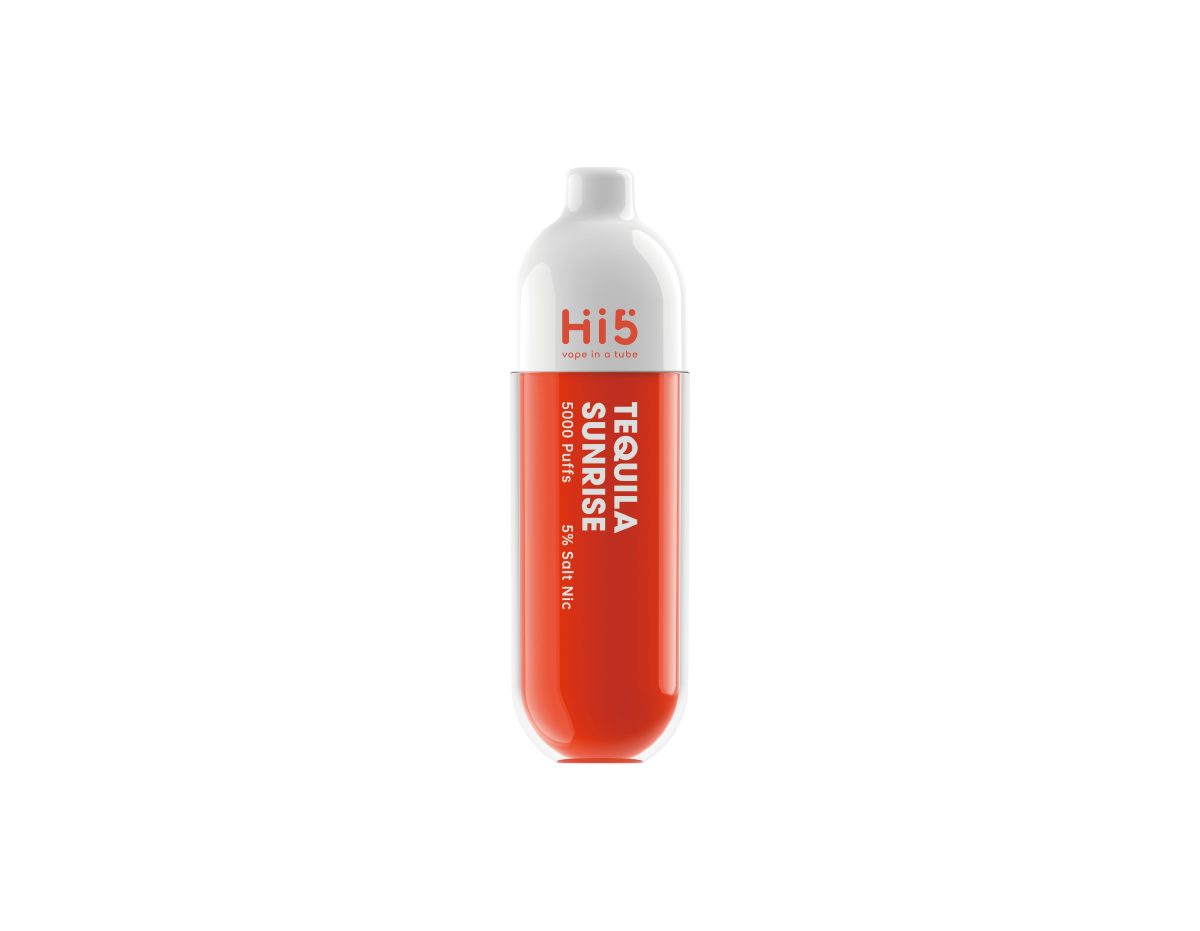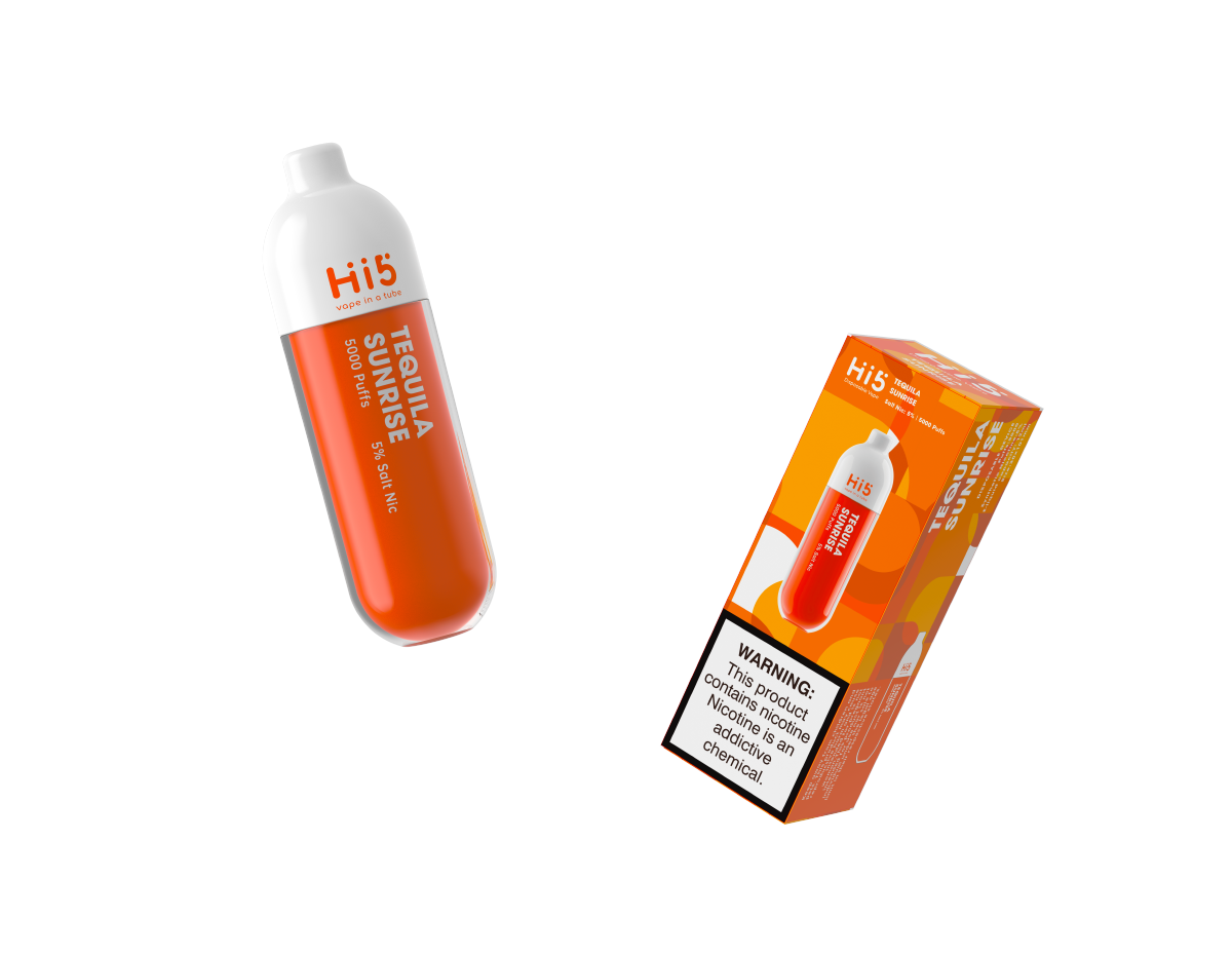 Hi5 Tube Disposable Vape Tequila Sunrise Flavor Nicotine:2%-5%. Synthetic Liquid Capacity: 12ml Battery Capacity: 650 mAh Resistance:1.0 Ω Coil: Mesh Coil Puffs: 5000
